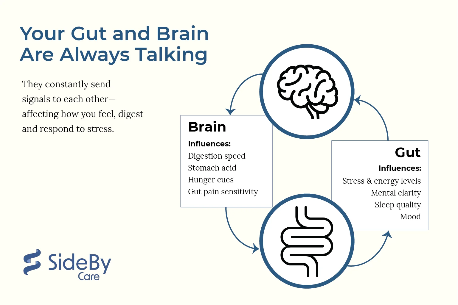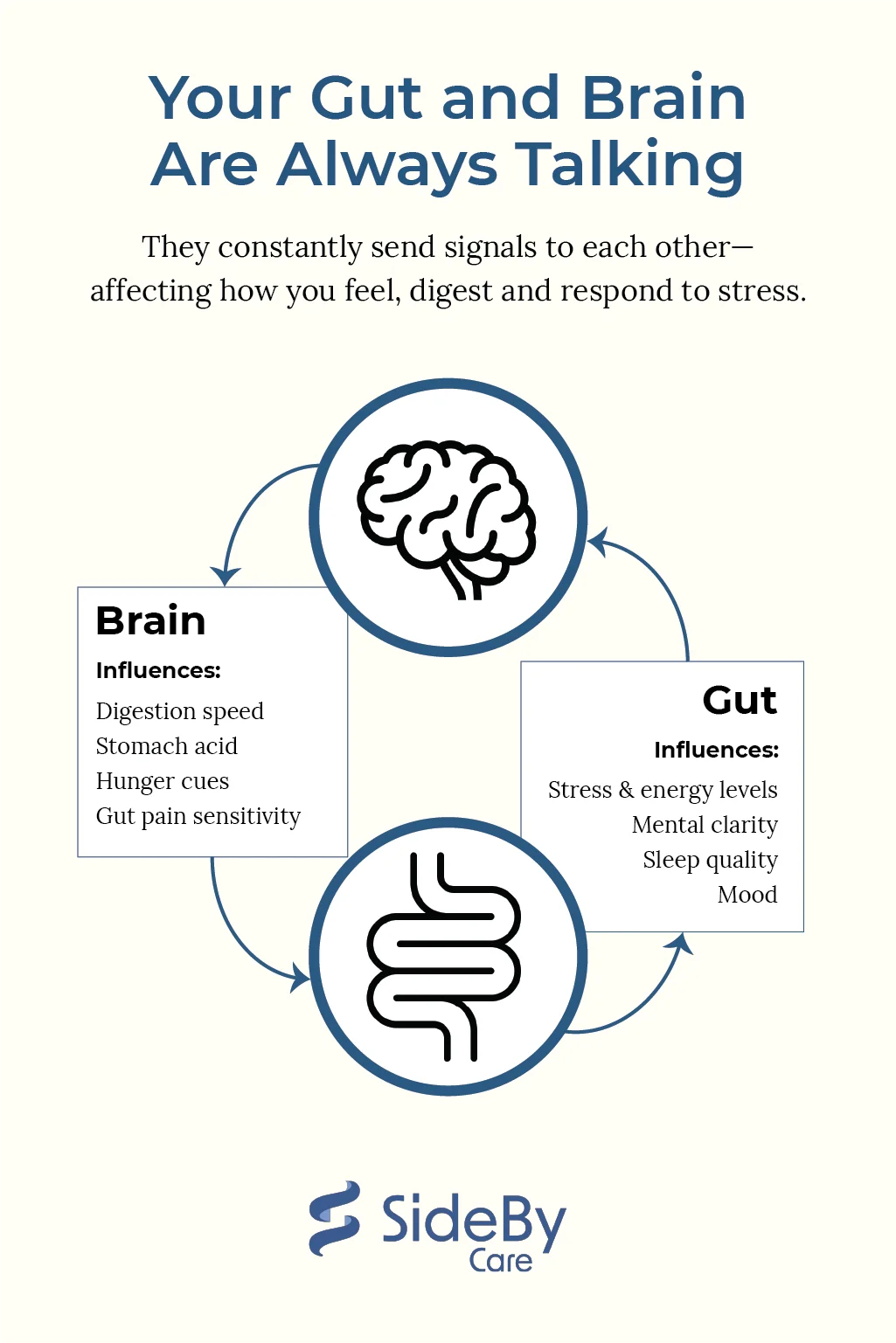 The SideBy Care Mind-Gut Program takes a whole-person approach to help you feel better. Your care plan will focus on nutrition, movement, sleep, stress, and thought patterns to treat symptoms and support long-term well-being.